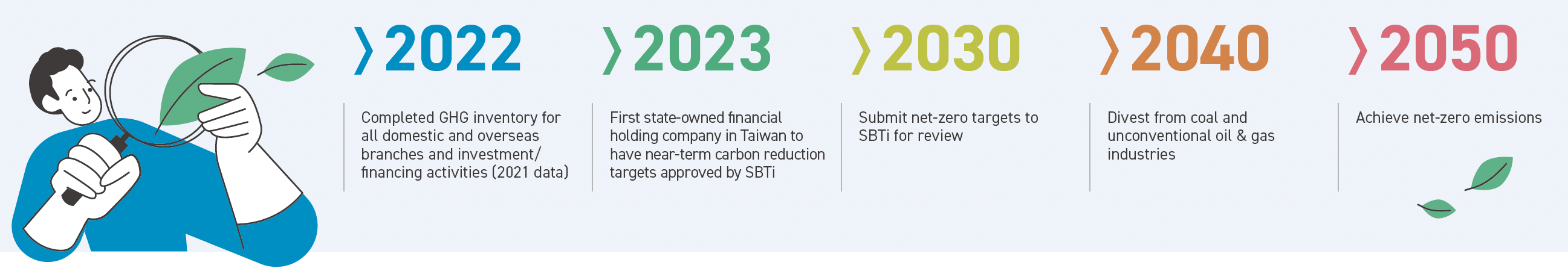 TCFHC continues to disclose climate- and nature-related information in accordance with the four pillars of TCFD and TNFD: governance, strategy, risk management, and metrics & targets. Its interim carbon reduction targets have been approved by the SBTi. In addition, TCFHC has set a timeline to phase out coal by 2040 and will continue advancing toward its 2050 net-zero target through scientific approaches and resilient risk management.
