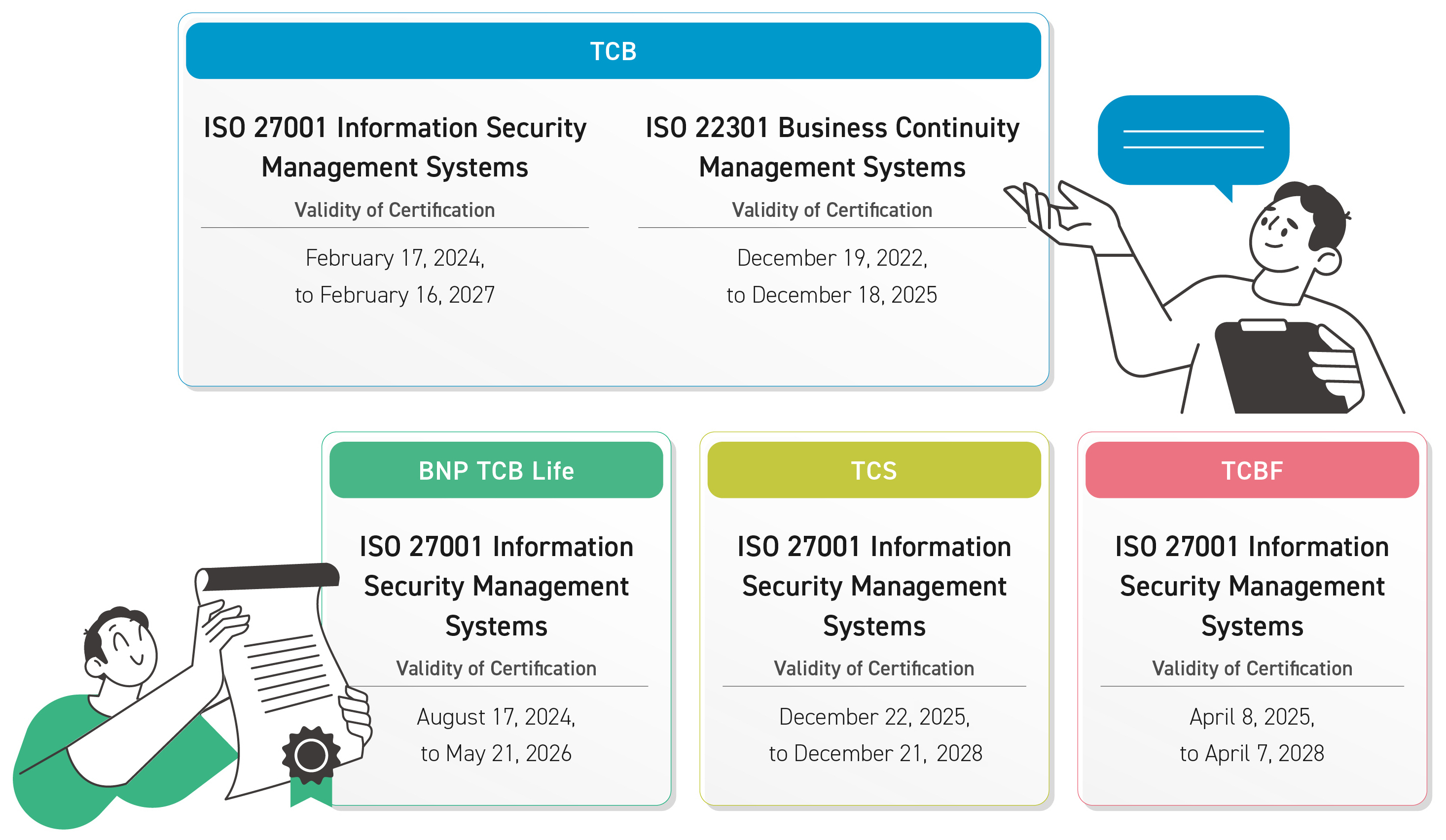To enhance information security intelligence sharing among financial institutions, the Company and its subsidiaries (TCB, TCS, BNP TCB Life, TCSIT, and TCBF) have all joined the “Financial Information Sharing and Analysis Center (F-ISAC)”. By sharing information on information security among members, the Company can assist in evaluating and suggesting regulations on information security and continue to improve protection measures.