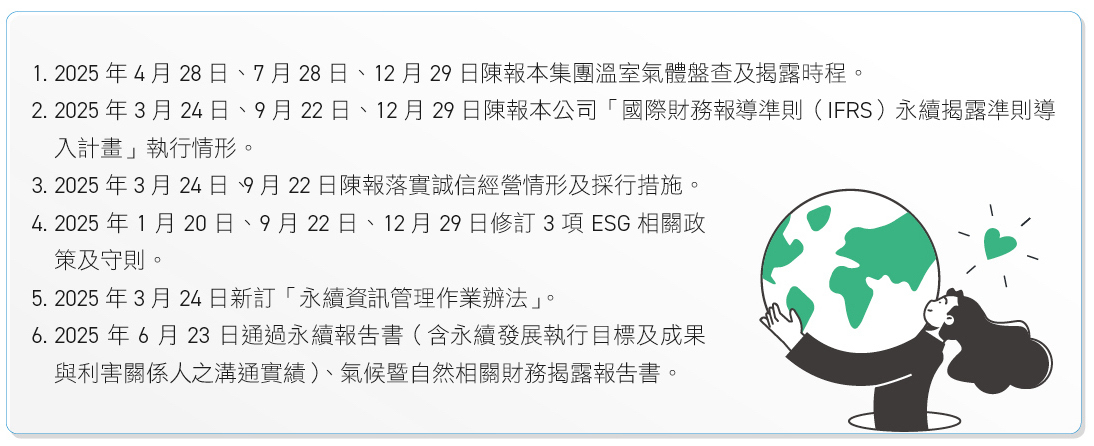 永續經營委員會至少每季召開 1 次,2025 年共召開 4次,議案包括追蹤小組年度目標與其他專案執行情形、審議 ESG 政策與規章、陳報IFRS永續揭露準則導入計畫執行情形與誠信經營執行情形等;另永續經營委員會及 6 大執行小組向董事會報告永續發展相關事項共計 14 次,董事會對永續發展之督導情形如下,議案均經董事詳加審視,充分討論並提出相關建議,以精進永續發展執行成效: