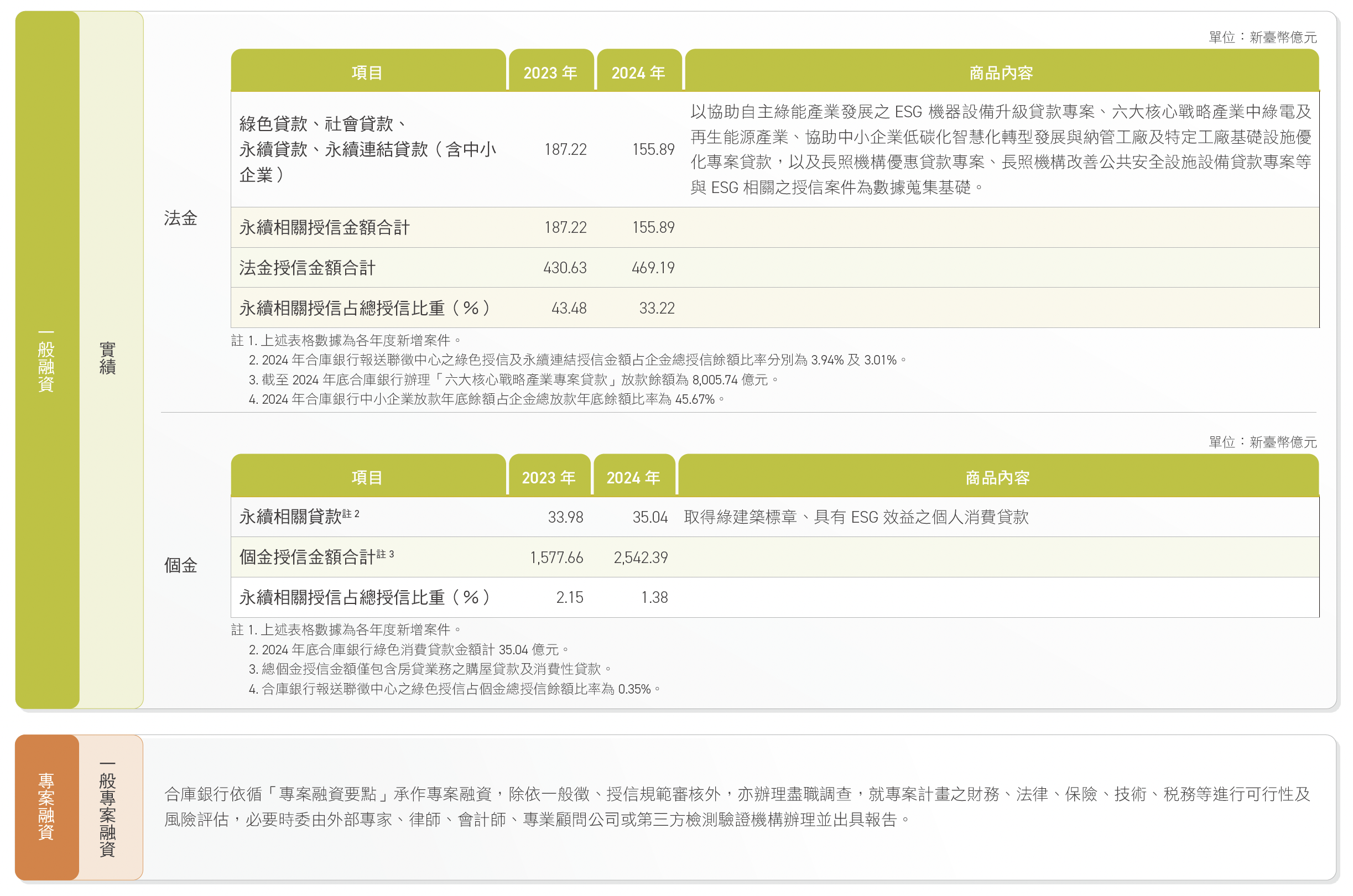 2024 年度依循赤道原則進行審核之專案融資案件共計核准 3 件,為專案融資及用於專案之公司貸款,本年度無專案融資諮詢服務、專案相關再融資及收購之案件。