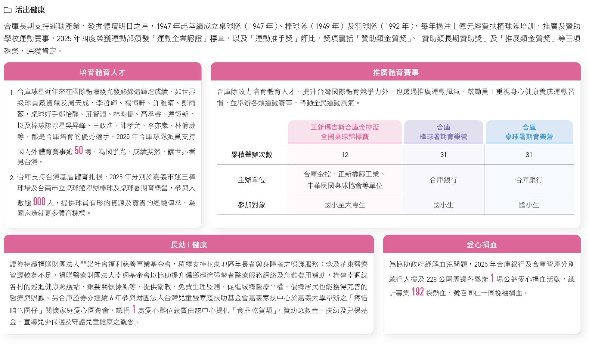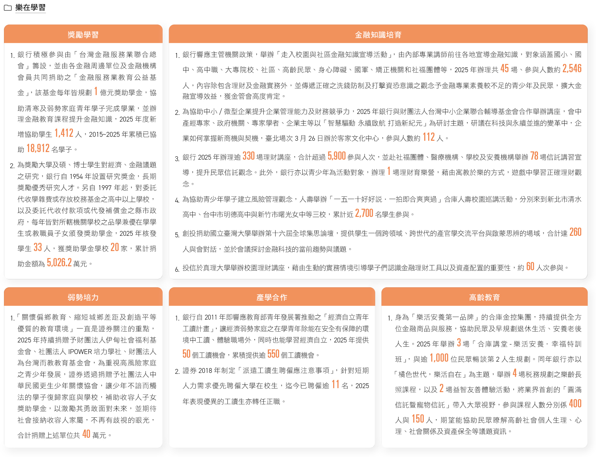 因應環境與社會結構轉型,合庫持續關注高齡化社會帶來的影響與商機,透過「樂」在學習、「活」出健康、「安」定社區、「養」護照顧4大公益策略,積極運用金融核心職能推出多項創新商品,以解決社會與環境問題,同時也不斷整合集團資源回饋社會、擴大社會影響力。